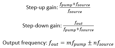 上面的參數放大器電路將通過混頻產生高次諧波和低次諧波。這些諧波在C3處產生,并輸出到惰輪電路中。僅通過使用非線性電抗組件(上面的變容二極管)進行混頻。電路產生的每個諧波以及每個組件的增益在下面的公式中定義。