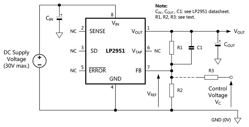 可以通過用可變電阻(例如微調電位器)代替固定電阻R1來調節輸出電壓。通過適當選擇R2,這可以使V OUT在高達30V的寬電壓范圍內變化。盡管這種方法具有靈活性,但仍存在局限性:特別是,它只能用于設置單個穩壓器的輸出電壓,并且需要手動調節電位計無法提供直接的線性電子控制方法。此外,通過檢查上述方程式可以發現,即使R1設置為零,V OUT也不能小于V REF(1.235V)。
