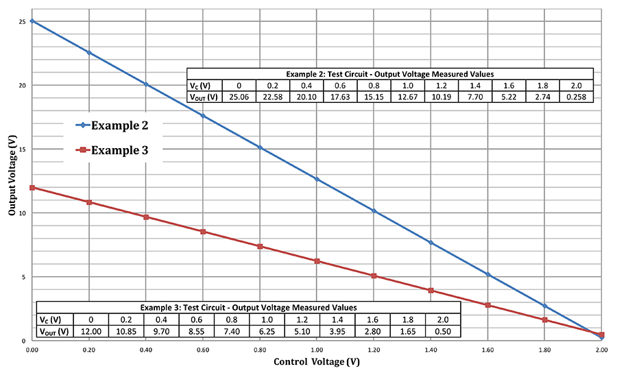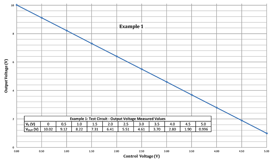 在此示例中,我們希望使用從0到5.0V的控制電壓來生成從1.0V到10.0V的輸出電壓,即,在V C(max) = 5.0V時出現的V OUT(min) = 1.0V ,并且V OUT(max) = 10.0V(在V C = 0 時發生)。