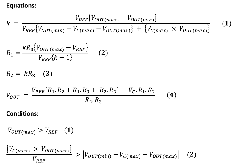 使用公式1 確定k后,為R3選擇一個首選值,然后使用公式2和3分別計算R1和R2的值。為了獲得R1和R2的合適的首選值,可能需要嘗試幾個不同的R3值。選擇R1,R2和R3的值后,可以使用公式4計算任意V C的V OUT值。