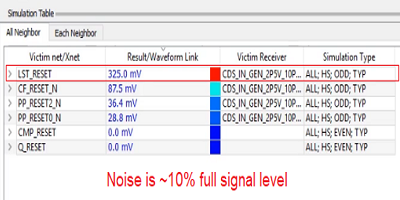 定義設置后,該工具將返回與設計規則進行比較的結果。結果以顏色編碼并按降序排列。盡管它們是用顏色編碼的,但您也可以看到一個數值結果,以便可以比較由于互連信號噪聲引起的峰值過壓/欠壓,并將其與信令標準進行比較。
