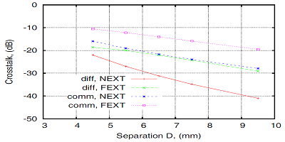 單端FEXT和NEXT隨著間距增大而變弱。 |