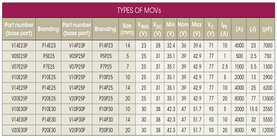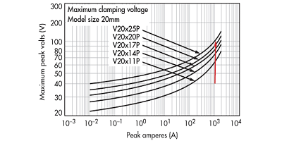 步驟2: 要確定要使用的MOV光盤大小,請首先確定最小滿足1000-A浪涌要求的MOV系列。檢查上表建議使用20毫米MOV和31伏直流最大連續額定電壓(部件號V20E25P)作為滿足要求的可能解決方案。