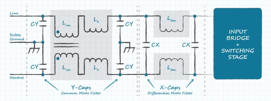外部電源通常在AC輸入電路中包含分立的電感和電容,以衰減噪聲從電源沿AC輸入電源線傳導出去的情況。內部PCB旨在容納這些組件,并且在安裝了組件的情況下執行了法規安全性測試。一旦電路設計和測試活動完成,為滿足客戶需求而對輸入過濾器元件進行的更改通常會非常麻煩。