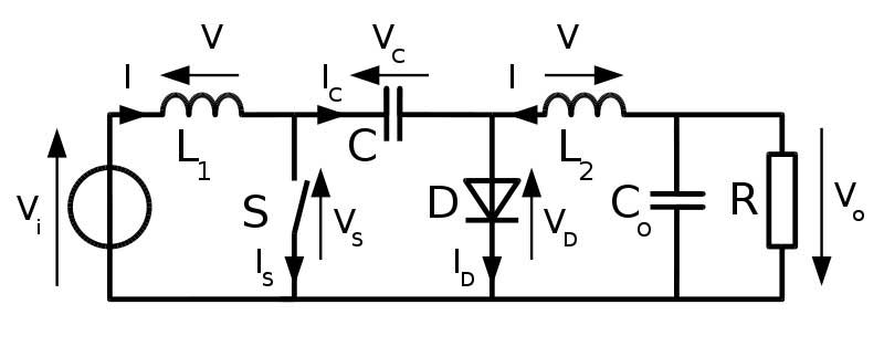 該轉(zhuǎn)換器由加州理工學(xué)院的Slobodan?uk教授設(shè)計(jì),由兩個(gè)電感器,兩個(gè)電容器,一個(gè)二極管和一個(gè)開關(guān)元件構(gòu)成。它可以升高和降低施加到其輸入端子的電壓。?uk轉(zhuǎn)換器的輸出具有與輸入電壓相反的極性。它還能夠在不連續(xù)電壓模式下運(yùn)行。這是在換向周期內(nèi)耦合電容器兩端的電壓降至零時(shí)的情況。附帶地,耦合電容器的存在降低了EMI輻射。