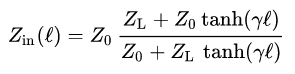 該傳輸線阻抗值在阻抗匹配中很重要,可以用來量化傳輸線何時超過臨界長度;請看鏈接文章,了解如何量化允許的阻抗失配。無需重復(fù)該文章中的所有內(nèi)容,輸入阻抗取決于特性阻抗,傳播常數(shù),負(fù)載阻抗和傳輸線的長度:
