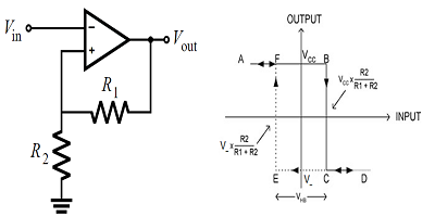 對于施密特觸發器,有意添加磁滯以將開關閾值設置為某個所需值。對于基于晶體管的比較器,可以使用分壓器通過另一個正反饋環路將滯后作用于輸出電壓。分壓器中的電阻值決定了磁滯窗口的大小和輸出波形的占空比。反向施密特觸發器的通用電路如下所示,該電路包括輸出信號上的磁滯窗口。