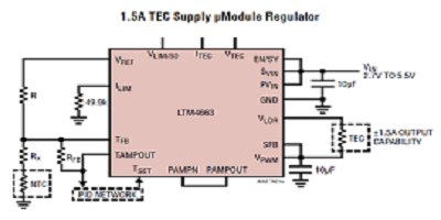 1. ADI公司的LTM4663是一款采用小型封裝的完整1.5A吸入,源熱電冷卻器(TEC)穩壓器。在支持熱敏電阻和RTD溫度傳感器的同時,它可以提供和吸收高達1.5 A的電流