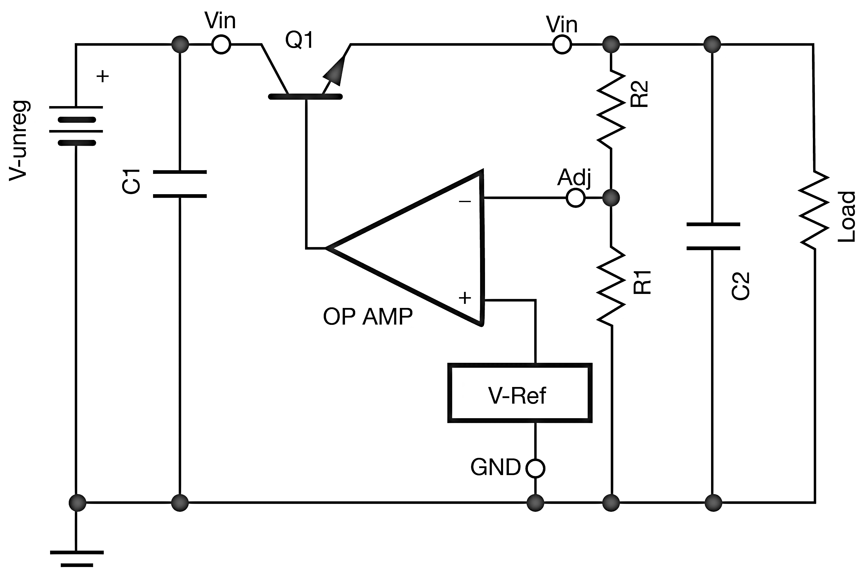 \典型的LDO穩壓器電路。該電路可用于功率調節器的輸出級,以補償輸入功率電平的下降