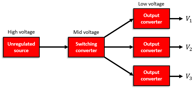 下面的流程圖顯示了一種典型的功率調節策略,其中在電源轉換器的輸出上使用了LDO。開關轉換器將未穩壓的輸入降壓并抑制低頻紋波。第二個開關轉換器將輸出剛好高于LDO裕量的電壓,并且LDO將輸出所需的電壓電平。