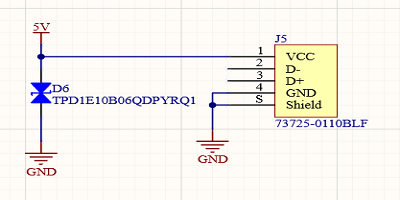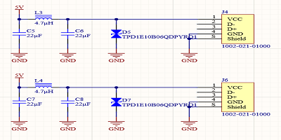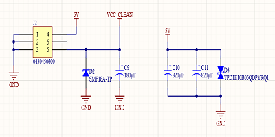 除了電源濾波之外,我還為每個(gè)輸入添加了一些基本的ESD保護(hù)。如果像許多貿(mào)易展覽會(huì)場(chǎng)館一樣跪在地毯上,準(zhǔn)備好相機(jī)準(zhǔn)備插入設(shè)備時(shí)會(huì)積聚靜電,這很容易導(dǎo)致ESD事件損壞相當(dāng)昂貴的設(shè)備。通過(guò)在輸入端和穩(wěn)壓器板上提供ESD保護(hù),我們應(yīng)該為攝像機(jī)提供相當(dāng)高的保護(hù)等級(jí)。我在主電源板上使用的5v線(xiàn)路使用的是相同的0402尺寸TVS二極管TI TPD1E10B06QDPYRQ1。這些雖然很小,但具有汽車(chē)認(rèn)證資格,并且可能能夠在中高濕度條件下處理海平面上的ESD事件。