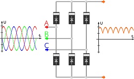 通常,您會發(fā)現(xiàn)使用晶閘管來代替二極管來調(diào)節(jié)電壓輸出。此外,大多數(shù)提供直流電的設(shè)備也會產(chǎn)生三相交流電。例如包含六個二極管的汽車交流發(fā)電機(jī),它可以作為全波整流器為汽車電池充電。