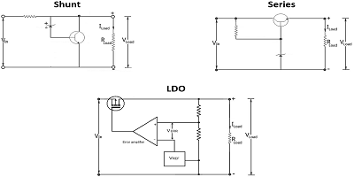 三種常見的線性電壓電路圖:(左)并聯,(中心)系列和(右)LDO
