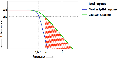 對于紅色曲線,ADC輸入頻率響應恰好在奈奎斯特頻率處被截斷。盡管您可以通過正確的過濾器集來接近,但這種理想的行為無法物理再現。大多數ADC的實際行為對于經常使用示波器的人們是熟悉的。響應是高斯或類似高斯的。處理PCB中的寬帶信號的一個更好的選擇是選擇一個帶寬接近藍色曲線的ADC。在這里,我們有一個“有效”奈奎斯特頻率,等于Fs / 2.5。