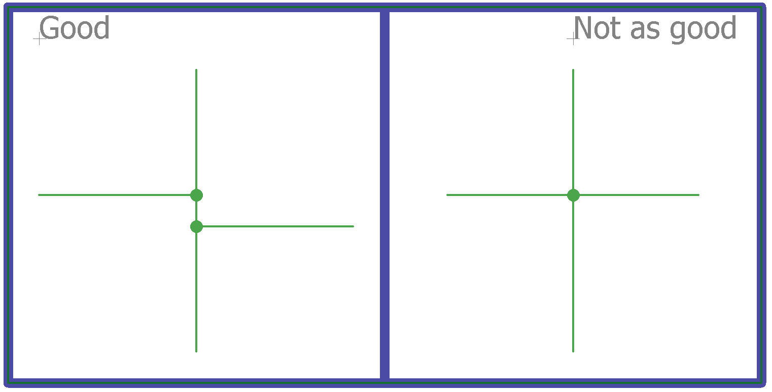 你可以看到有和沒(méi)有連接點(diǎn)的一組重疊和連接的網(wǎng)絡(luò)。當(dāng)添加相交的結(jié)點(diǎn),還建議避免四通,因?yàn)檫@可能會(huì)增加讀取電路時(shí)的混亂。而是選擇一組共享的交叉點(diǎn),如下圖所示,其中每個(gè)交叉點(diǎn)都有自己的唯一連接。這樣可以更輕松地準(zhǔn)確理解正確的連接并避免誤解。