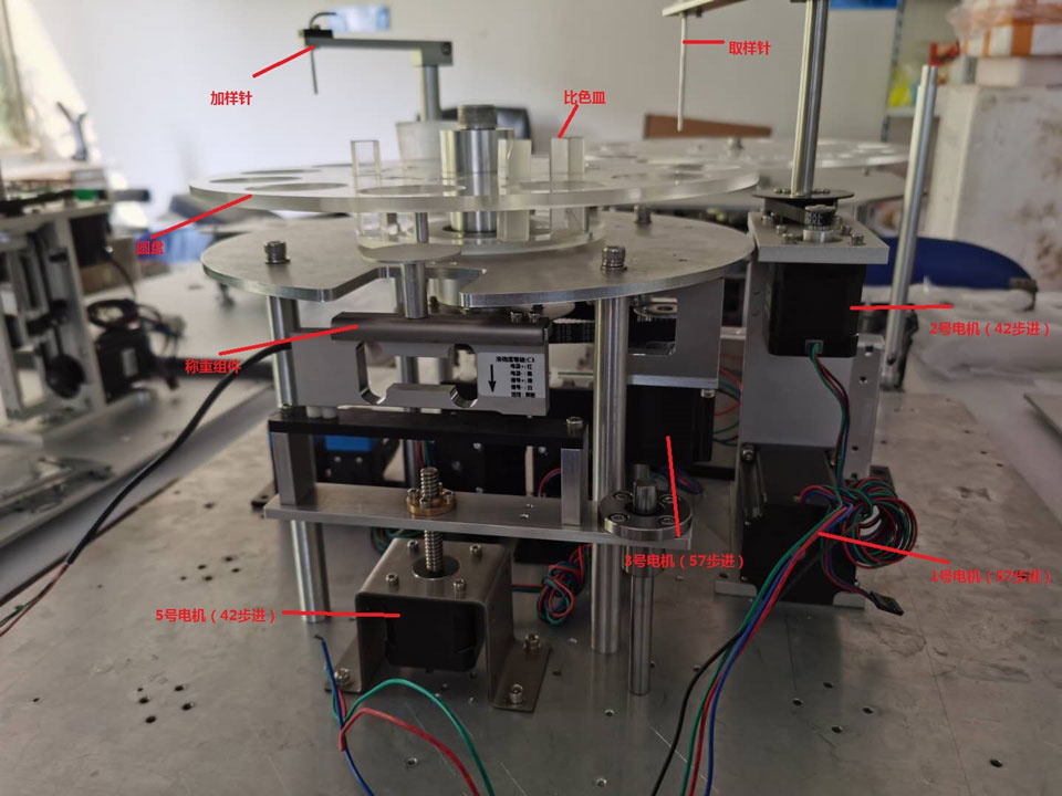 四、稱量完成,圓盤開始轉(zhuǎn)動(3號電機動作),第一個樣本位轉(zhuǎn)動至加樣針的位置,開始加樣液(加樣量根據(jù)樣本重量決定,0.1g的樣本對應0.5ml的樣液)(6號電機動作)。